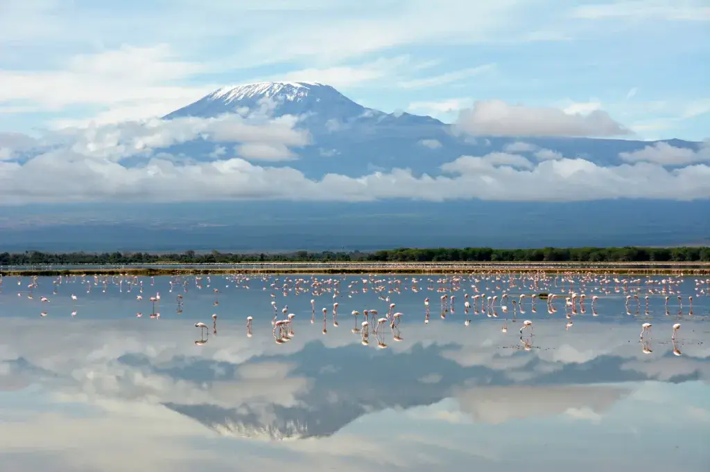 Vom Amboseli-Nationalpark in Kenia hat man einen atemberaubenden Blick auf den Kilimanjaro (5.895 m), den höchsten Berg Afrikas. Obwohl er in Tansania liegt, beeinflusst er maßgeblich das Wetter und die Regentage des Parks zu seinen Füßen. Die schneebedeckte Bergsilhouette über der weiten Savanne macht Amboseli zu einem der ikonischsten Naturpanoramen Ostafrikas.